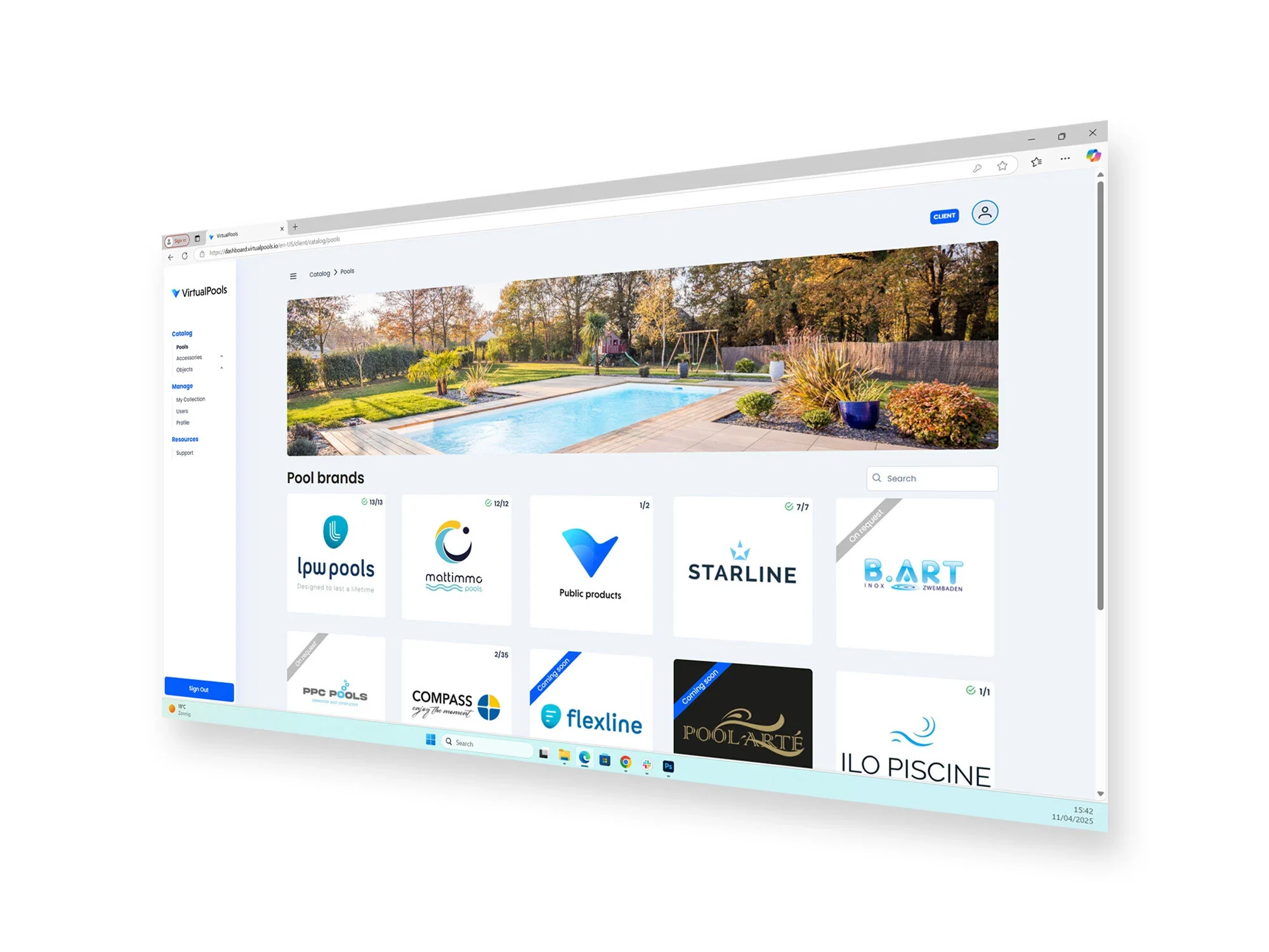 Manufacturers and suppliers in the pool industry are welcome to join the VirtualPools ecosystem. We will add your products to our catalog, making them visible to a wide network of pool professionals who can present them directly to their end customers.